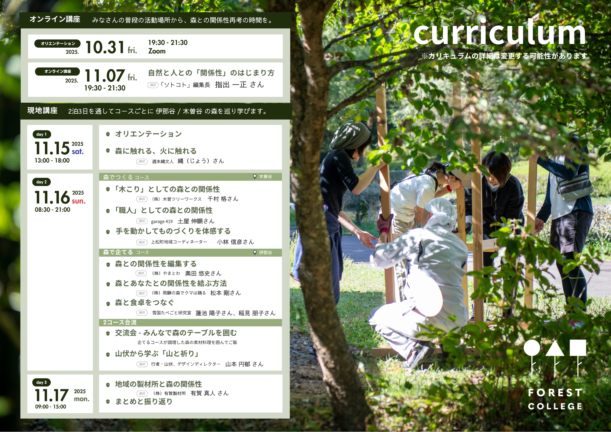 終わってしまうのがもったいない、何かしらの形で続けられたらいいなという想いが重なり、今までのフォレストカレッジから現地講座のエリアとカリキュラムを一部リニューアルし、この秋、再び開催を決定いたしました!